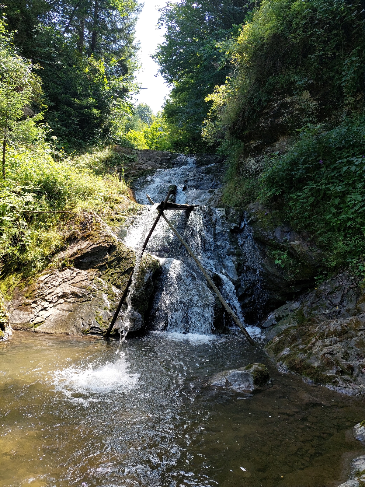 Висота водоспаду — понад 14 м. Розташований у місці, де невеликий лісовий потічок стрімко (місцями прямовисно) збігає похилою скелею. Дещо нижче водоспаду потічок впадає в річку Верхнє Середню, яка є правою притокою Великорожинки (басейн Черемошу).