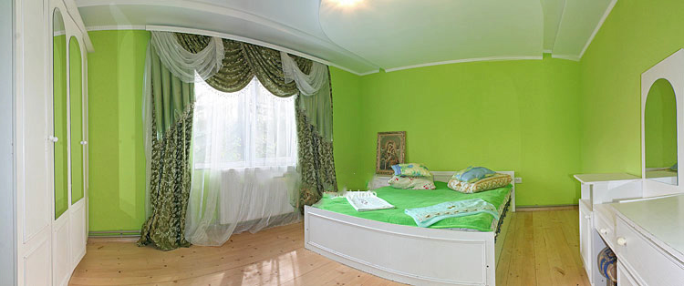 Двоповерховий будинок на 5 номерів (15 місць). На першому поверсі — кухня (кухонне вогнище, електрична плита, холодильник, електрочайник, посуд, мийка);